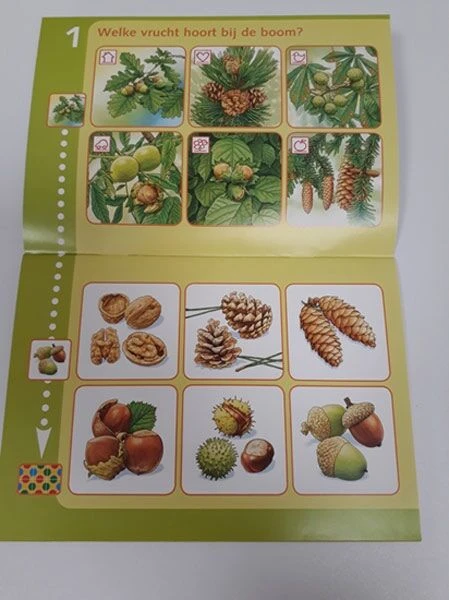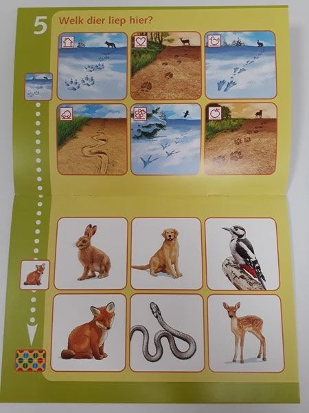 Enkele voorbeelden uit dit bambino loco boekje zijn: Welk nest hoort bij deze vogels? Kan jij dezelfde boom herkennen in de zomer en in de winter? Ken jij de sporen van de dieren? Wat hoort er niet thuis in het bos. Kijk goed naar de prenten en los op.