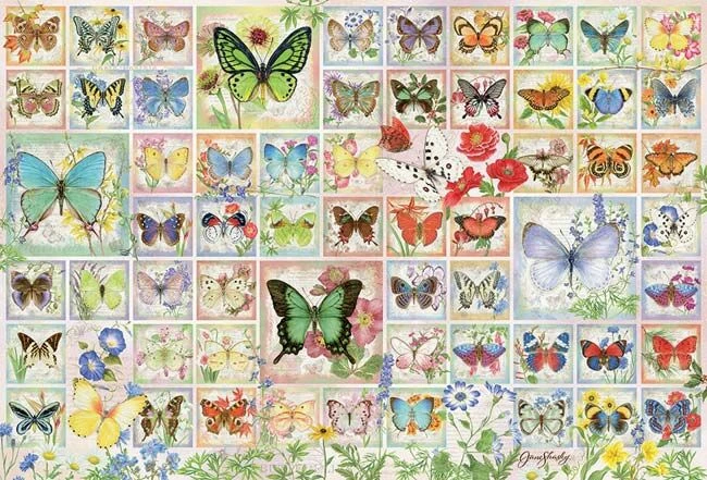 In the puzzle Butterflies and Blossoms you will discover a beautiful collage of butterflies. The artist Jane Shasky designed the image.