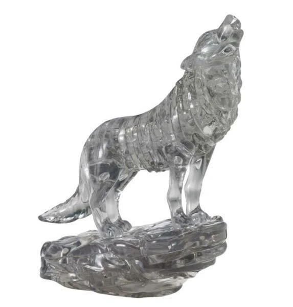 Pas de 37 stevige kunststof puzzelstukjes van de wolf in elkaar. De afgewerkte puzzel oogt als kristal.
