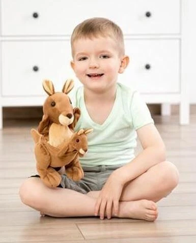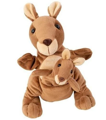 Dit is een handpop van een grote kangoeroe met een kleintje. Het kleintje kan veilig in de buidel schuilen.