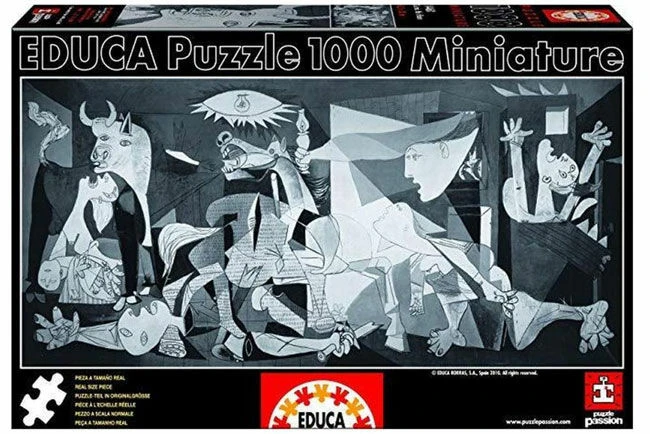 Deze legpuzzel bevat een afbeelding van Guernica, een schilderij van Pablo Picasso. Op het schilderij toont de Picasso het bombardement op Guernica in 1937 tijdens de Spaanse Burgeroorlog op een artistieke manier. Doordat het een zwart-wit afbeelding is, vormt het een hele uitdaging om de puzzel te leggen!