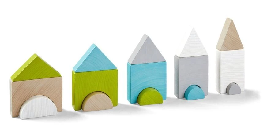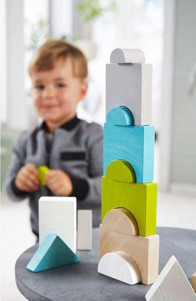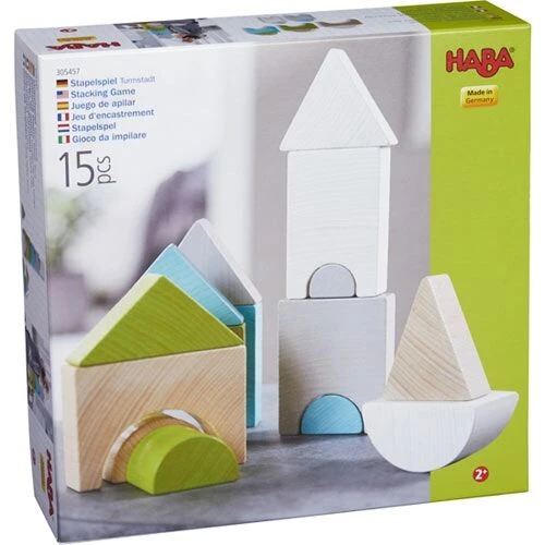 Stapelspel Torenstad van HABA bestaat uit 15 stevige houten blokken in verschillende formaten. Steen op steen kan je de hoogte in bouwen.Doordat de blokken verschillende kleuren hebben, krijg je telkens een mooi resultaat.